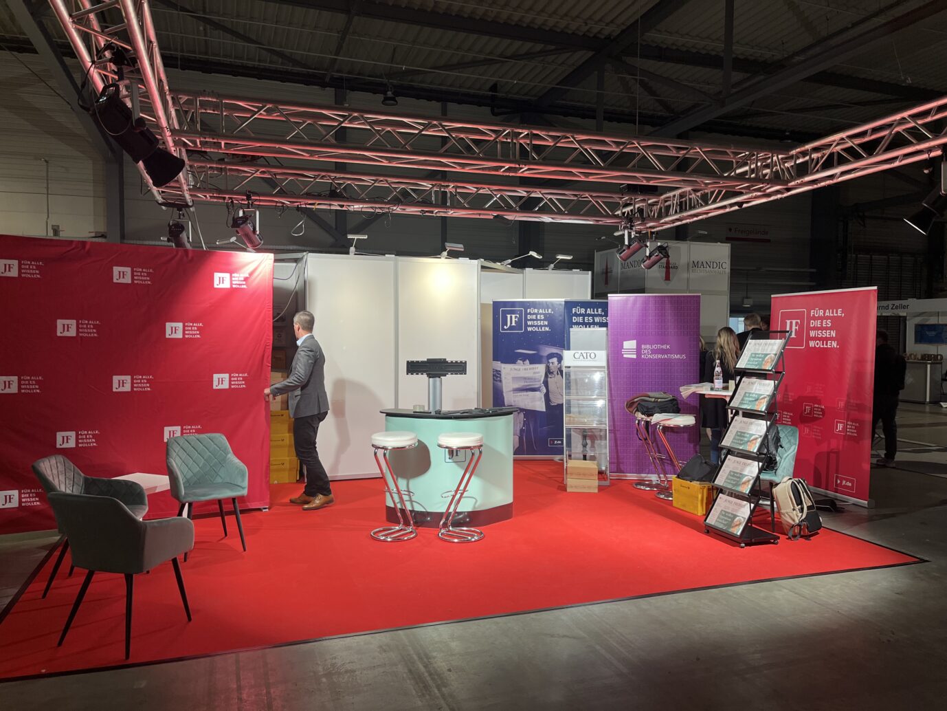8:45 Uhr: In der noch recht verwaisten Messehalle werden letzte Vorbereitungen am JF-Stand getroffen. Mit dabei: Chefredakteur Dieter Stein. Die Bibliothek des Konservatismus und das Cato-Magazin gesellen sich dazu. Wie Sie sehen können, gibt es viel zu entdecken. Kommen Sie doch einfach mal bei uns vorbei!