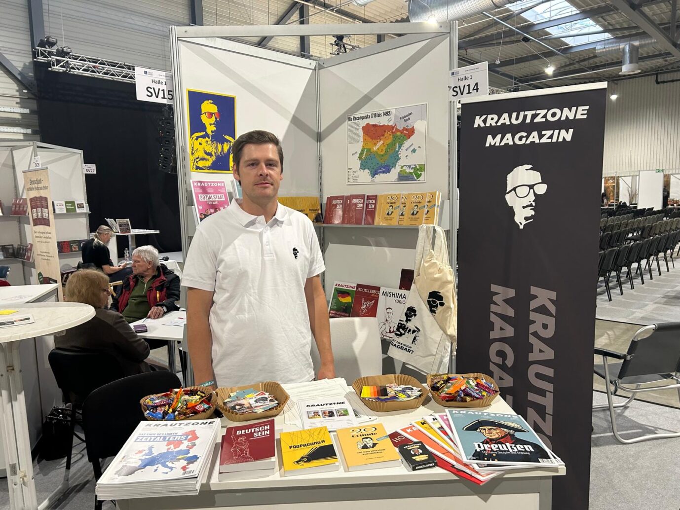 09:00 Uhr: Der Stand des Gerhard-Hess-Verlag wurde bereits am Vortag aufgebaut. „Unser Stand ist klein, aber fein. Zum Glück verlief der Aufbau gut“, berichtet uns eine Mitarbeiterin. Alles sei „eng beieinander“. Der Verlag bietet unter anderem Übersetzungen von Alain de Benoist, einen Roman des Bruders von Benjamin Netanjahu, Iddo Netanjahu, und ganz neu, das Sachbuch „Kriegstüchtig oder postheroisch?“ von Reiner Fink, an.