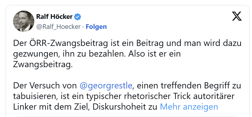 Doch der Widerstand gegen diese Empörung wächst. Medienanwalt Ralf Höcker konterte auf X: „Der ÖRR-Zwangsbeitrag ist ein Beitrag, und man wird dazu gezwungen, ihn zu bezahlen. Also ist er ein Zwangsbeitrag.“ Der Versuch von Restle, den Begriff zu tabuisieren, sei „ein typischer rhetorischer Trick autoritärer Linker, um Diskurshoheit zu erlangen“. Seine Empfehlung: „Man sollte erst recht offensiv von Zwangsbeitrag sprechen.“