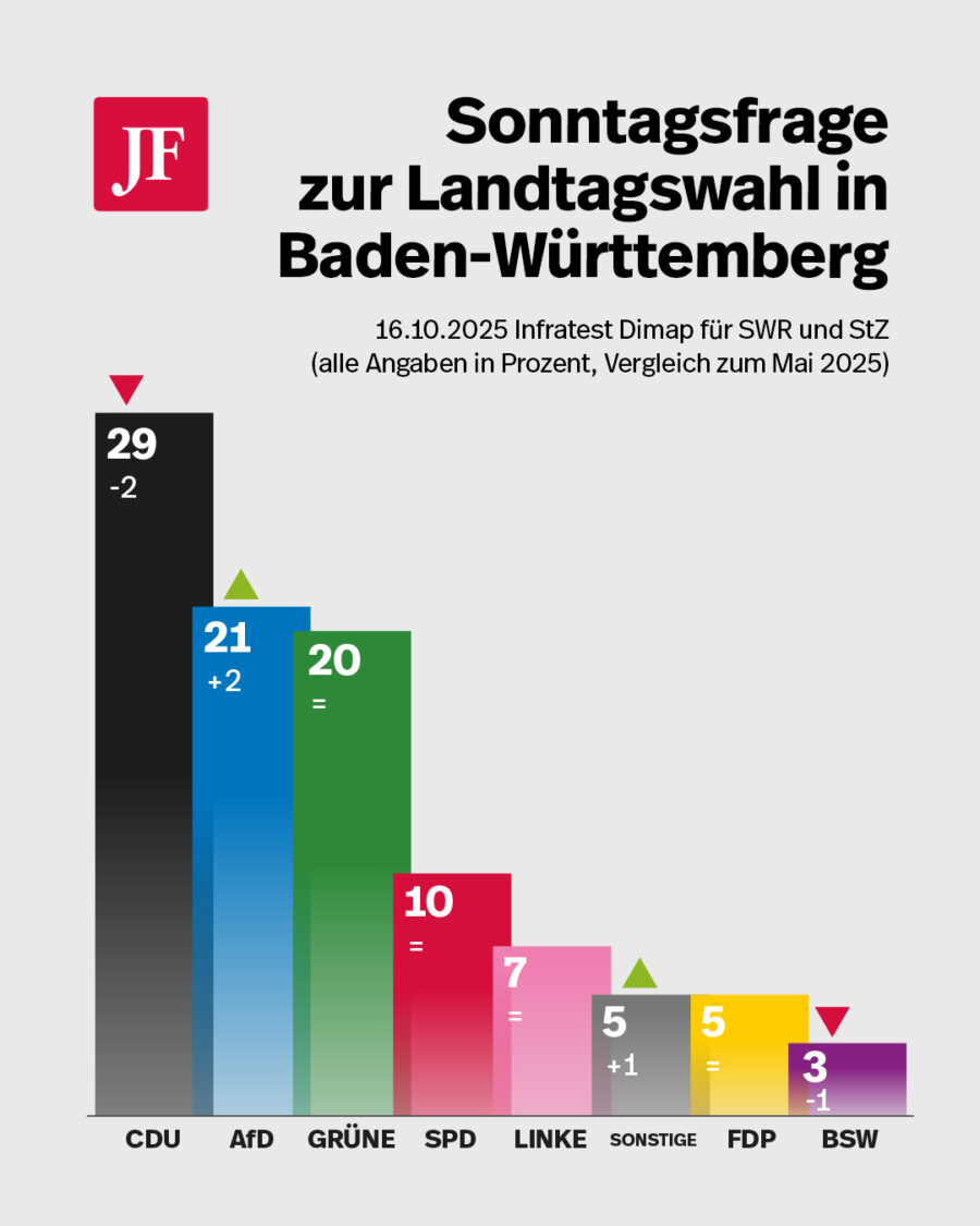 STUTTGART. Die AfD hat in einer neuen Umfrage des Instituts Infratest dimap in Baden-Württemberg einen neuen Höchststand erreicht. Würde die Landtagswahl am kommenden Sonntag stattfinden, käme die Partei auf 21 Prozent. Gegenüber der Befragung zuvor gewann sie zwei Prozentpunkte hinzu und zog an den regierenden Grünen vorbei. Die Partei des Ministerpräsidenten Winfried Kretschmann liegt unverändert bei 20 Prozent.