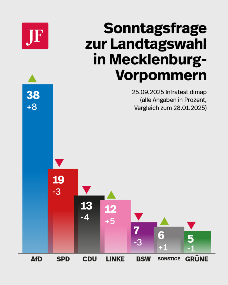 Im Moment ist die Oppositionspartei in Mecklenburg-Vorpommern damit stärker als SPD, CDU und Grüne zusammen. Die CDU kommt auf 13 Prozent, die Grünen auf fünf und müssen um den Wiedereinzug in das Schweriner Schloß bangen. Die selbsternannten „demokratischen Parteien der Mitte“ erreichen damit gemeinsam 37 Prozent – ein Punkt weniger als die AfD allein.