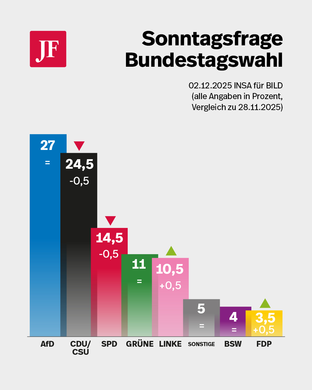 Die Partei erreicht 27 Prozent und gewinnt einen Punkt hinzu. Die Union rutscht dagegen auf 24,5 Prozent ab. Der Abstand zwischen beiden Lagern beträgt damit 2,5 Punkte – so groß wie noch nie seit Beginn der Erhebung.