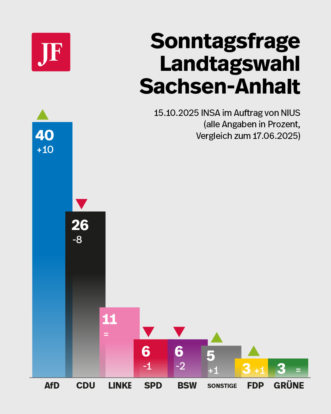 BERLIN. Erstmals in der Geschichte der Bundesrepublik hat die AfD in einer Umfrage die 40-Prozent-Marke geknackt. Wäre am kommenden Sonntag Landtagswahl in Sachsen-Anhalt, würde die Partei von Alice Weidel und Tino Chrupalla 40 Prozent erreichen, wie aus einer Umfrage des Insa-Instituts im Auftrag des Nachrichtenportals Nius hervorgeht. Das sind zehn Prozentpunkte mehr als bei der Juni-Befragung des Instituts.