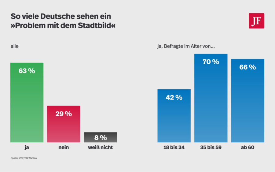 Die höchste Zustimmung genießen die „Stadtbild“-Äußerungen in der Altersgruppe von 35 bis 59 Jahren mit 70 Prozent. Bei den Befragten über 60 geben knapp zwei Drittel dem Bundeskanzler recht. Unter den 18- bis 34jährigen stimmen ihm hingegen nur 42 Prozent zu.