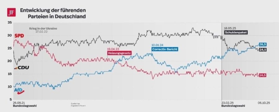 Trotz der Zahlen bleibt Kanzler Friedrich Merz bei seiner bisherigen Linie. Wie die JF berichtete, erklärte er, die AfD sei auch in den kommenden Wahlauseinandersetzungen „unser Hauptgegner“. Zuvor hatten mehrere Unionspolitiker gefordert, den Umgang mit der AfD zu überdenken.