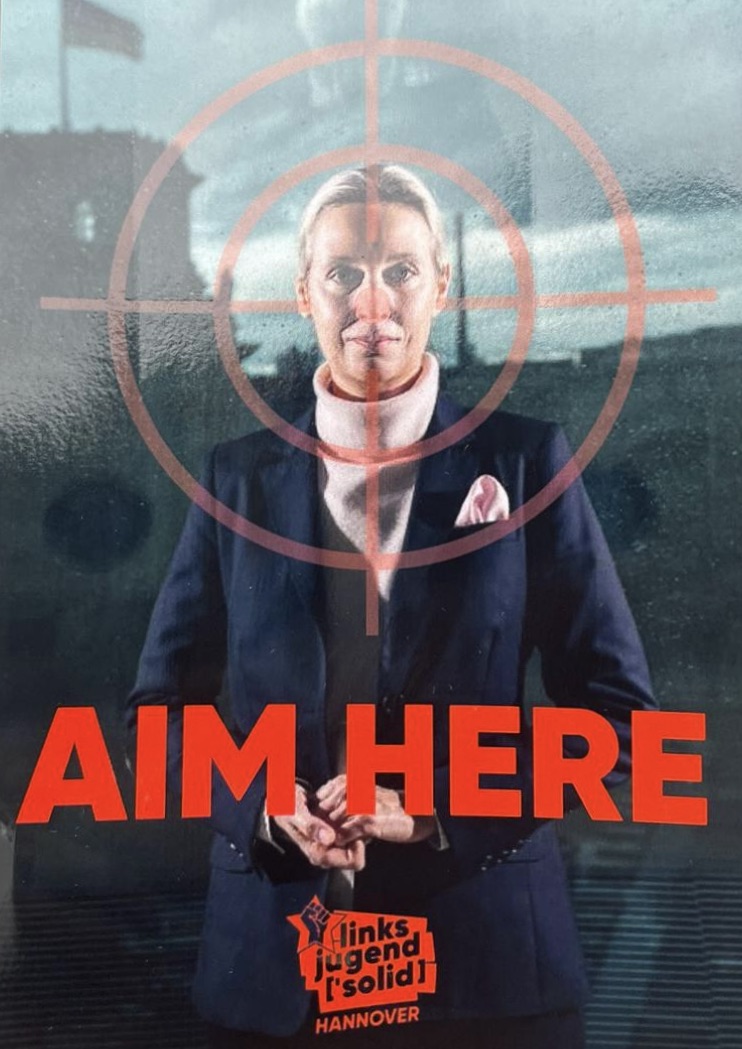 Zuvor hatte die AfD-Stadtratsfraktion Hannover in der vergangenen Woche auf den Aufkleber hingewiesen. Darauf zu sehen ist: Weidel, auf deren Kopf ein großes Fadenkreuz platziert ist; darunter steht auf Englisch: „Aim here“, zu Deutsch: „Zielt hierauf“. Am unteren Rand des Aufklebers prangt das Logo der Linksjugend in Hannover. Die Polizei sagte zur JF, daß die Urheberschaft Gegenstand der laufenden Ermittlungen sei.