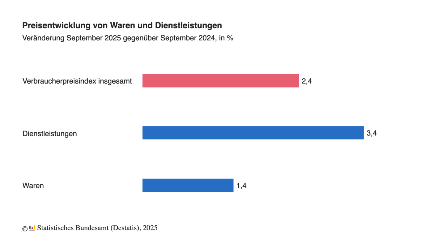 Die Inflation stieg in Deutschland zuletzt wieder leicht an: Sie lag im September bei plus 2,4 Prozent, im August waren es noch 2,2 Prozent, im Juli und Juni des laufenden Jahres jeweils 2,0 Prozent. Für Dienstleistungen mußten Menschen in Deutschland im September 3,4 Prozent mehr zahlen als im Vorjahresmonat. Auch hier stieg die Teuerungsrate im Vergleich zum August an – damals lag sie bei 3,1 Prozent.
