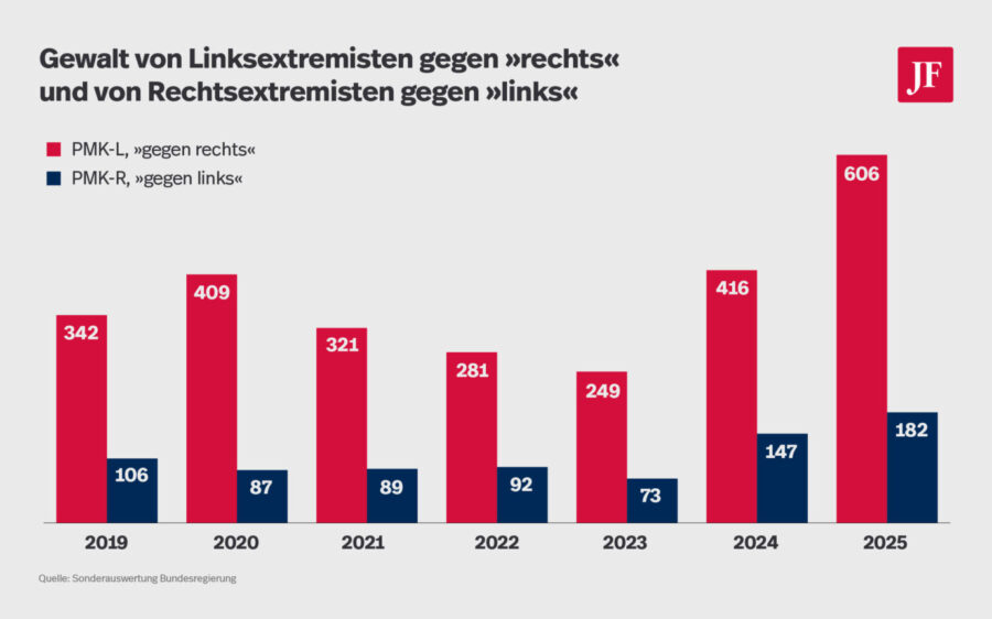 Im Vergleich zum Vorjahr zeigt sich ein deutlicher Anstieg. 2024 hatten die Behörden 416 linksextreme Angriffe auf Rechte gezählt. Damit stieg die Zahl binnen eines Jahres um gut 31 Prozent. Auch die Zahl rechtsextremer Gewalttaten nahm zu, allerdings deutlich schwächer. Sie lag im Vorjahr bei 147 Fällen. Bereits seit 2019 registrieren die Sicherheitsbehörden Jahr für Jahr deutlich mehr linksextreme Angriffe auf Rechte als umgekehrt, wie die JUNGE FREIHEIT bereits im Mai 2025 berichtete. Die erfaßten Taten stammen aus dem Bereich politisch motivierter Gewalt und richten sich jeweils gegen politische Gegner.