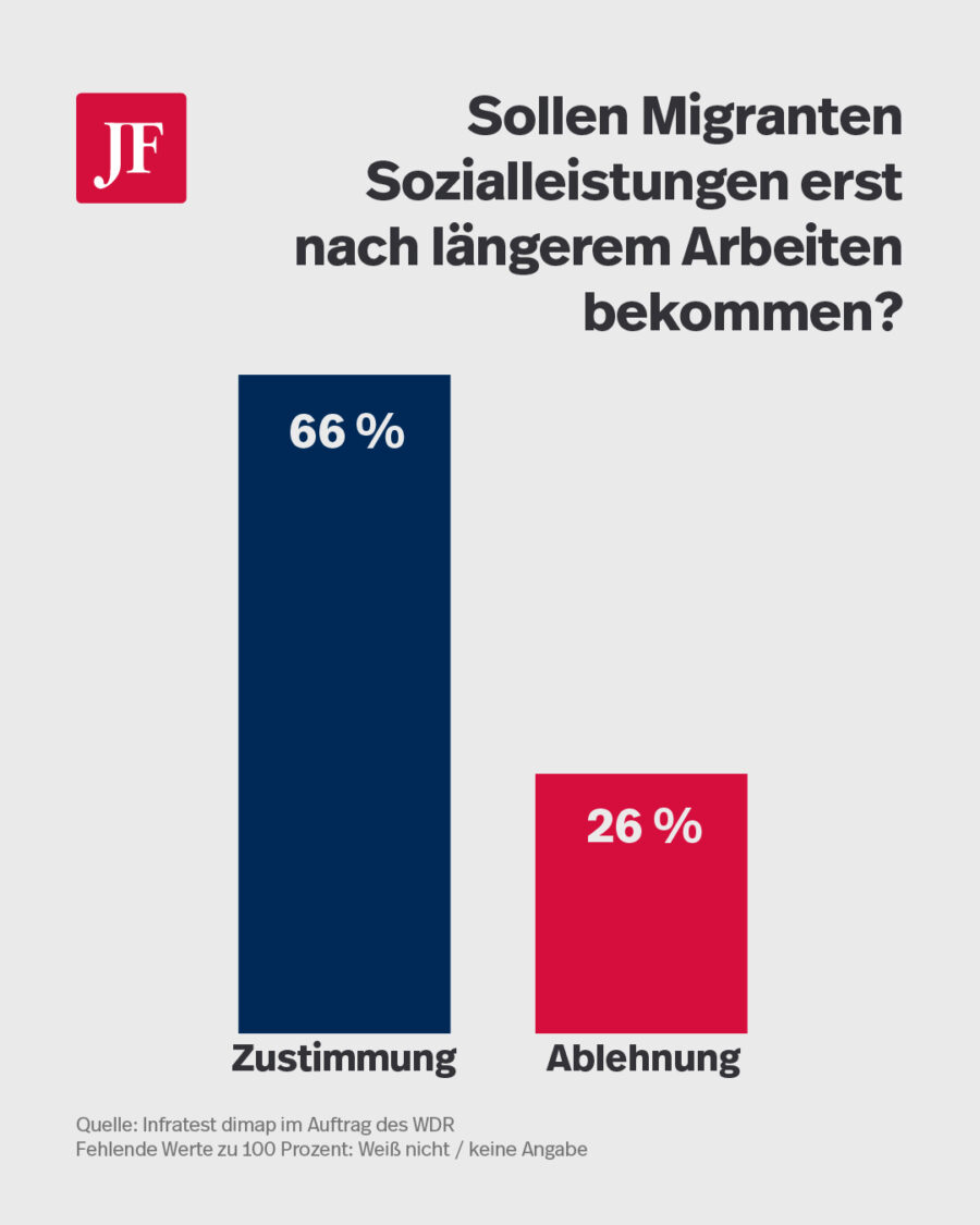 KÖLN. Zwei Drittel der Deutschen wollen, dass Migranten nur noch Sozialleistungen erhalten, wenn sie eine längere Zeit in der Bundesrepublik gearbeitet haben. Insgesamt stimmen laut einer Umfrage von Infratest dimap im Auftrag des WDR 66 Prozent dieser Aussage zu, 26 Prozent lehnen das ab.