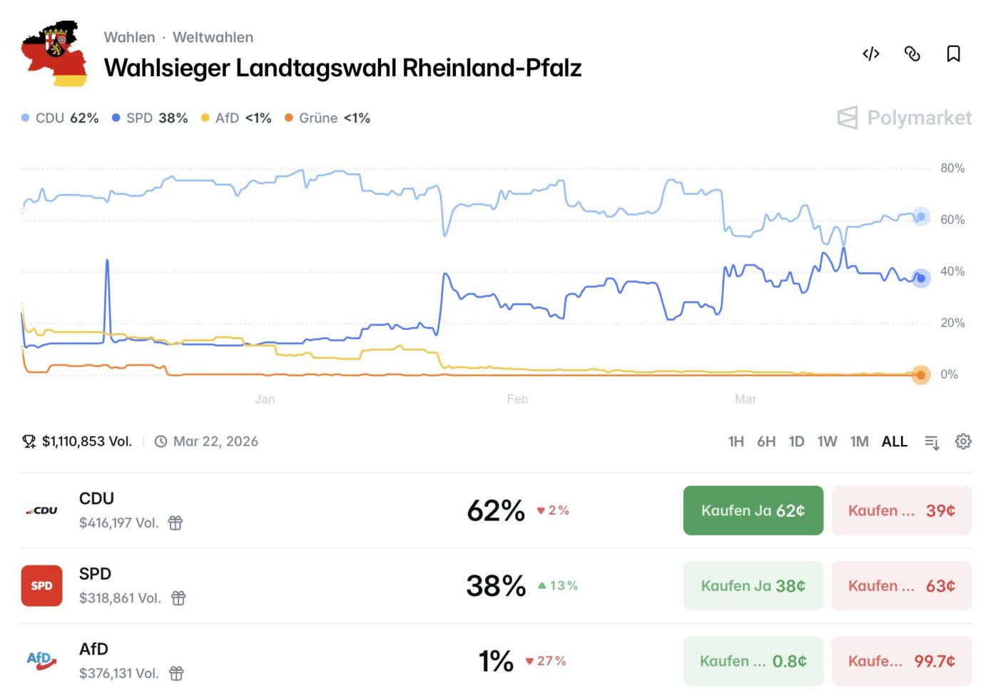 14.15 Uhr: Der internationale Wettanbieter „Polymarket“ hält die CDU für den eindeutigen Favoriten auf den Wahlsieg. Den Christdemokraten wird eine 62prozentige Gewinnwahrscheinlichkeit zugerechnet, die SPD liegt bei 38 Prozent. Die AfD steht bei einem Prozent.