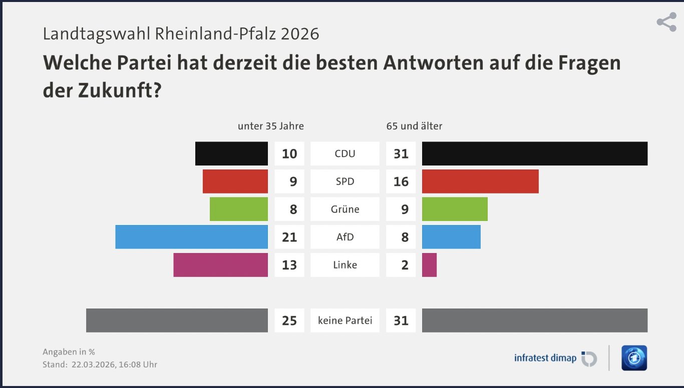 19.57 Uhr: Durch die Generationen geht ein Riss. Während die über 65jährigen noch glauben, CDU oder SPD hätten die besten Antworten auf die Fragen der Zukunft, liegt bei den unter 35jährigen bereits die AfD klar vorn. Auch die Linkspartei schneidet bei den Jüngeren besser ab.