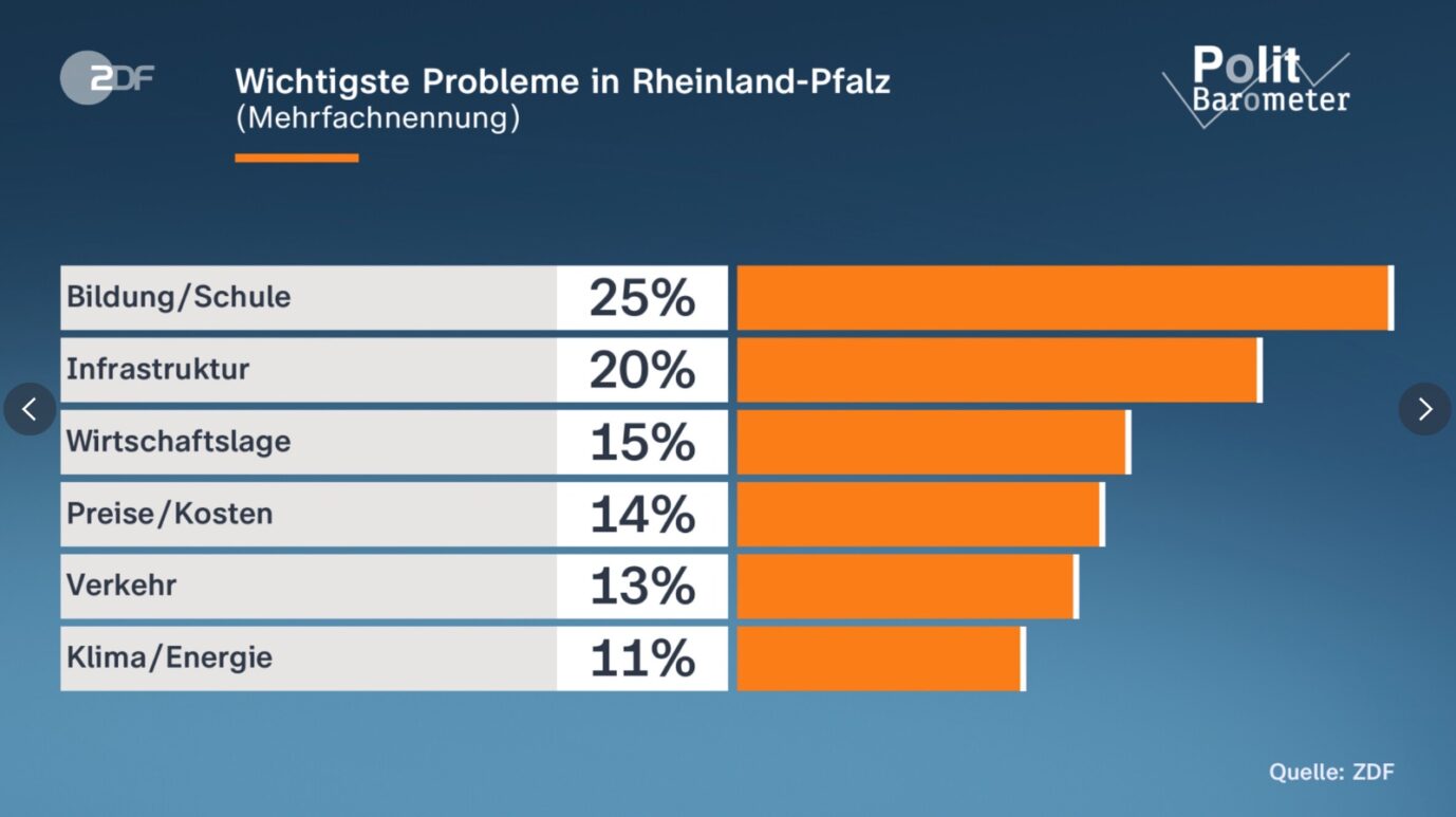 Und wo sehen die Wähler den dringendsten Verbesserungsbedarf? Laut dem ZDF-Politbarometer von der Forschungsgruppe bezeichnet jeder vierte Befragte die Bildung als das wichtigste Problem, gefolgt von der Infrastruktur mit 20 Prozent. Die aktuelle Wirtschaftslage ist für 15 Prozent der Wähler ein Problem, die Preisentwicklung für 14 Prozent. Das Schlusslicht bilden Klima und Energie mit elf Prozent, noch hinter der Verkehrspolitik, die für 13 Prozent ein Problem darstellt. Innere Sicherheit und Migration werden dort aber nicht aufgelistet.
