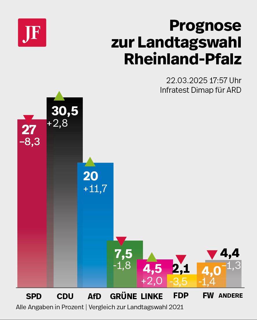 2021 setzten sich die Sozialdemokraten mit Ministerpräsidentin Manu Dreyer mit 35,7 Prozent gegen die Union durch, die auf 27,7 Prozent kam. Das war das historisch schlechteste Ergebnis der CDU in dem Bundesland, in welchem sie bis 1987 – oft mit absoluter Mehrheit – die Wahlen gewann. Seit 1991 hat die SPD die Nase vorn. Auf dem dritten Platz landeten die Grünen mit 9,3 Prozent, dicht gefolgt von der AfD, die 8,3 Prozent erreichen konnte.