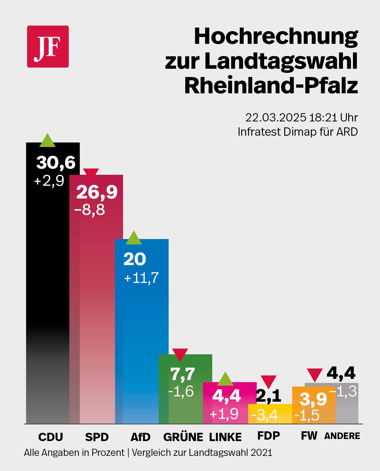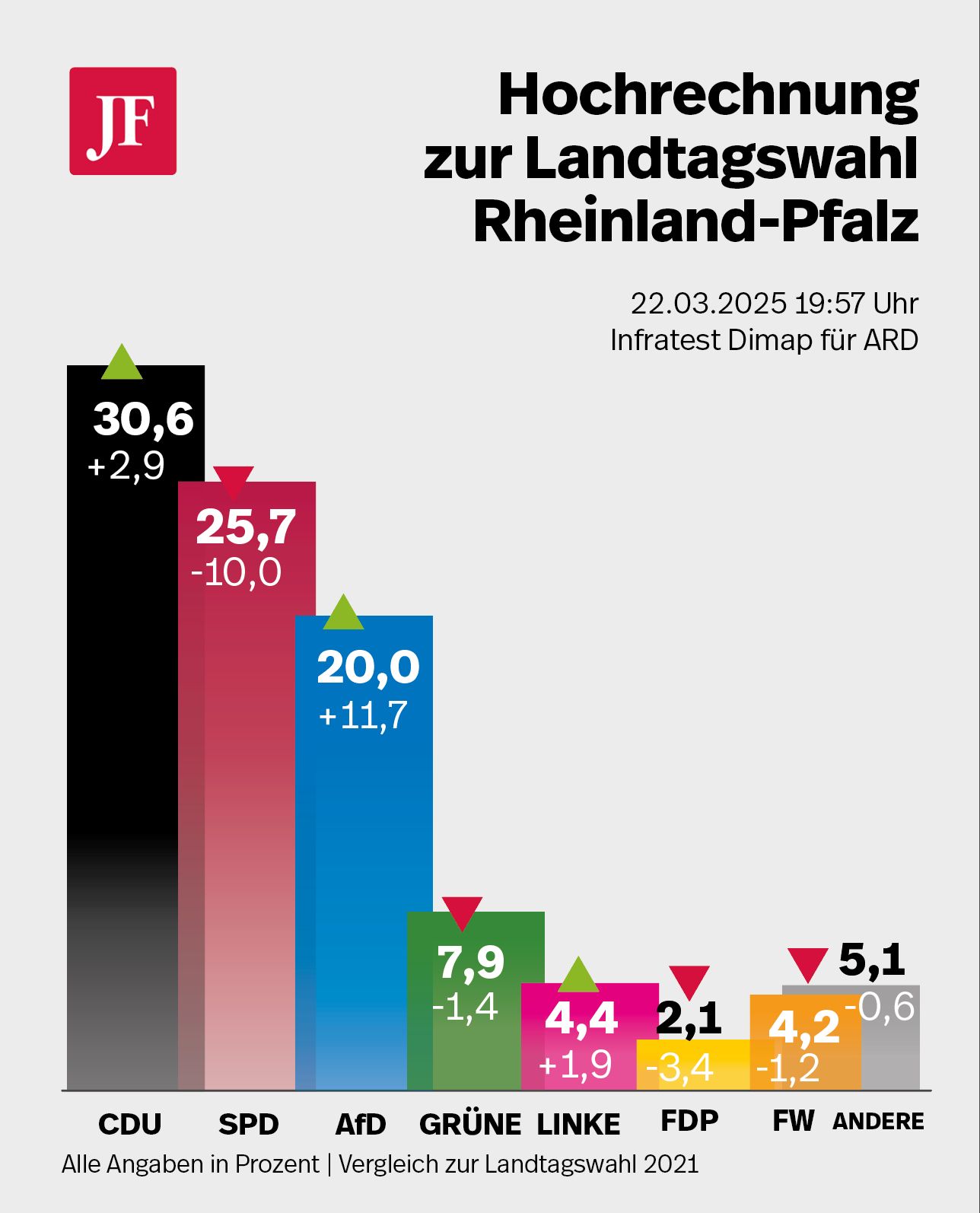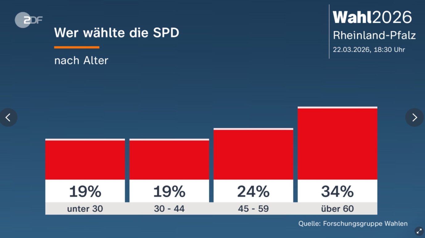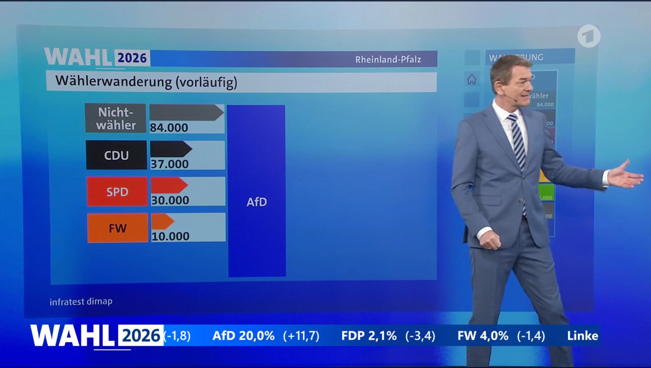 19.27 Uhr: Am Ende konnte die SPD fast nur von den Verlusten ihrer Regierungspartner profitieren: Laut einer Wählerwanderungsprognose des Infratest Dimap, wechselten 4.000 FDP-Anhänger und 20.000 Grüne von der Landtagswahl 2021 zur Partei von Alexander Schweitzer. Dazu kommen noch 10.000 Nichtwähler. Dagegen „flohen“ 74.000 Ex-SPD-Wähler zur CDU, weitere 30.000 zur AfD.