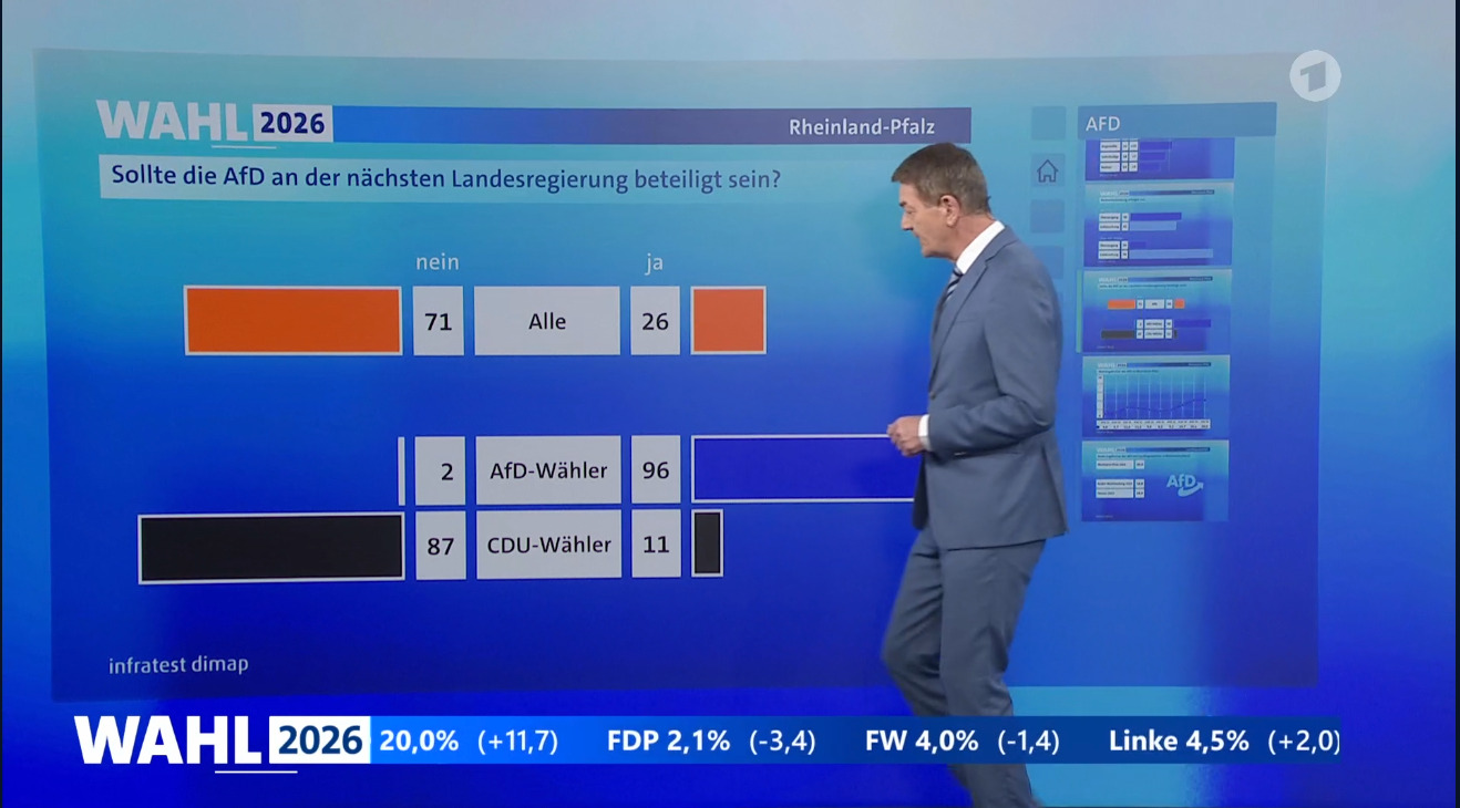 18.13 Uhr: AfD-Chefin Alice Weidel zeigt sich auf dem Kurznachrichtendienst X erfreut über das Ergebnis. „20 Prozent für die AfD in Rheinland-Pfalz: eine Verdoppelung des Ergebnisses gegenüber der letzten Landtagswahl! Herzlichen Glückwunsch zu diesem großen Erfolg und herzlichen Dank an alle Wähler und Wahlkämpfer!“