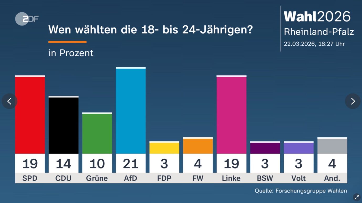 18.41 Uhr: Sieg für die AfD bei Jungwählern: Laut Forschungsgruppe Wahlen stimmten 21 Prozent der Wähler zwischen 18 und 24 Jahren für die Partei, gefolgt von der SPD und der Linkspartei mit jeweils 19 Prozent. Die CDU kommt hier auf lediglich 14 Prozent, Grüne auf zehn, die FDP landet gleichauf mit dem BSW und Volt auf drei Prozent. Davor liegen noch die Freien Wähler mit vier Prozent.