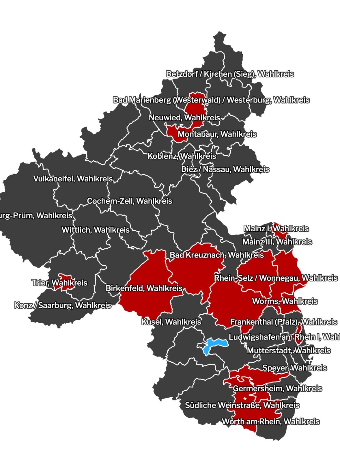 Ihr bestes Ergebnis erreichte die AfD in den südlich gelegenen Wahlkreisen Kaiserslautern und Pirmasens. Im ersteren kam AfD-Fraktionsvize im Bundestag, Sebastian Münzenmaier, auf 25,5 Prozent, unterlag aber knapp dem SPD-Kandidaten Matthias Mieves, der 28 Prozent erreichte. Im Wahlkreis Pirmasens hingegen verlor die AfD-Bundestagsabgeordnete Iris Nieland das Rennen mit ihrem CDU-Kontrahenten Florian Bilic mit 25,1 Prozent zu 33,3 Prozent. In den zugehörigen Gemeinden sind Direktmandate auch bei der heutigen Landtagswahl am ehesten zu holen.