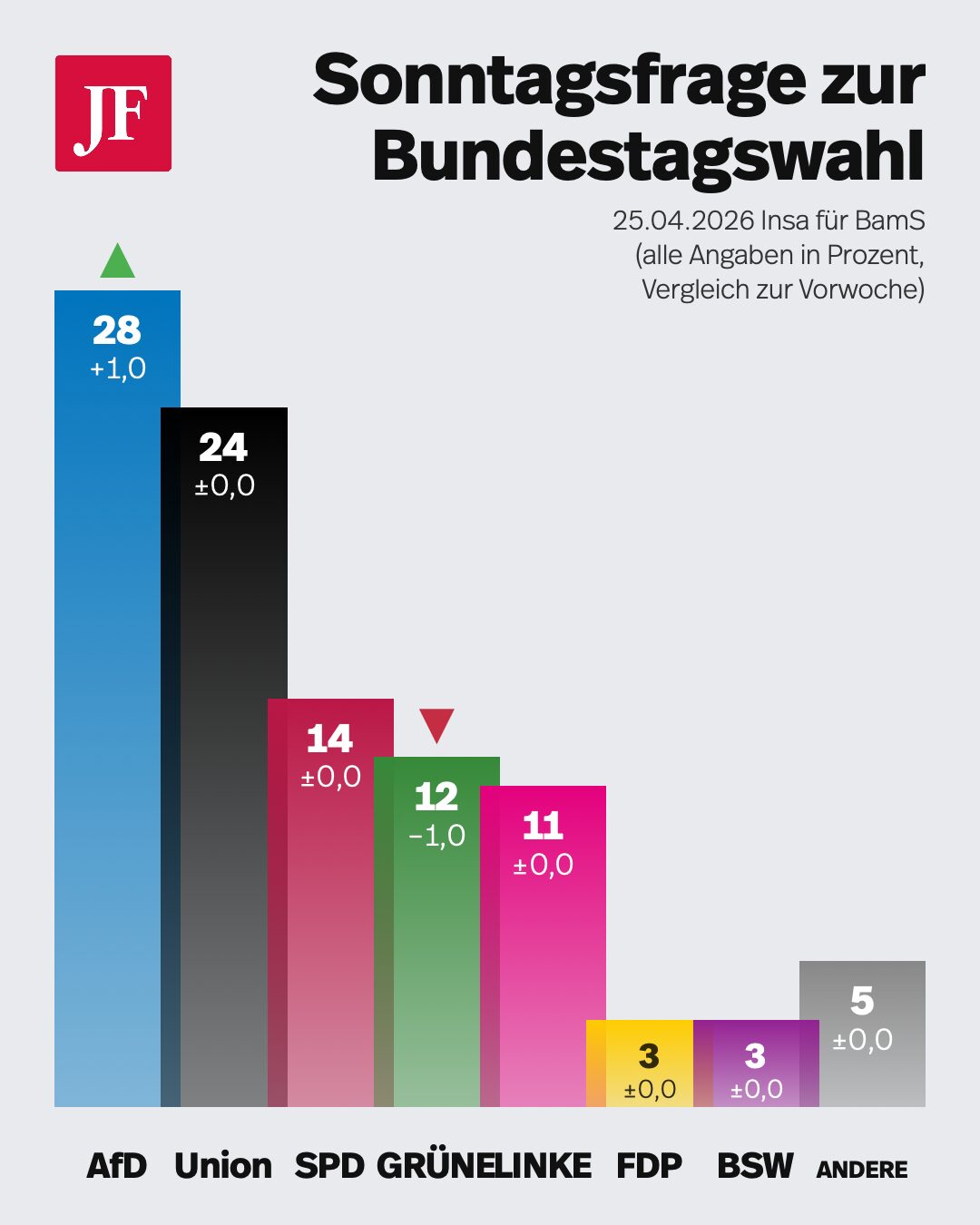 Innerhalb der vergangenen zwei Wochen hatte Insa die AfD in vier separaten Umfragen auf 26 bis 27 Prozent taxiert (JF berichtete). Die SPD kommt in der neuesten Umfrage unverändert auf 14 Prozent. Die Grünen schaffen es auf 12 Prozent, die Linke auf 11 Prozent.