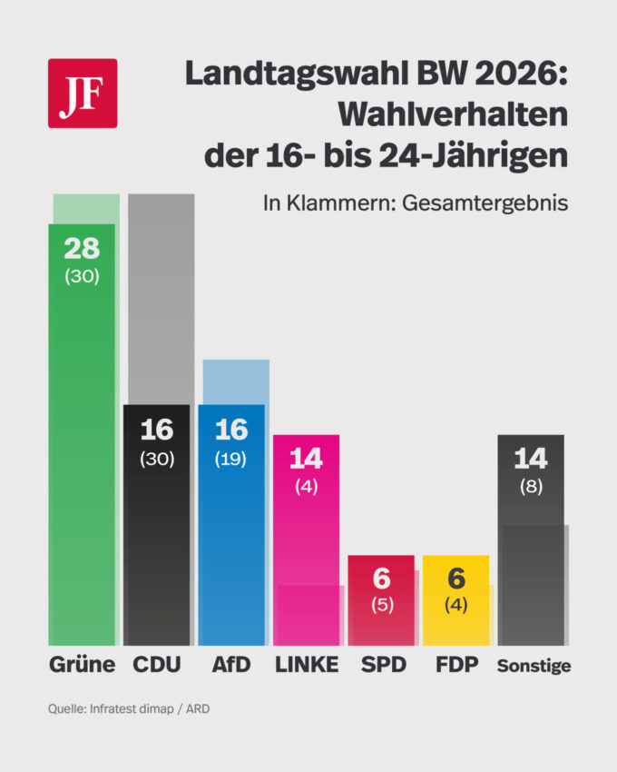 Auf die Linkspartei entfielen 14 Prozent der jungen Stimmen. Vor dem Hintergrund des Gesamtergebnisses (4,3 Prozent) ist das eine beeindruckende Zahl. Allerdings hatte die Reichinnek-Partei bei der Bundestagswahl noch 25 Prozent und damit so viele Jungwähler wie keine andere Partei hinter sich versammeln können.