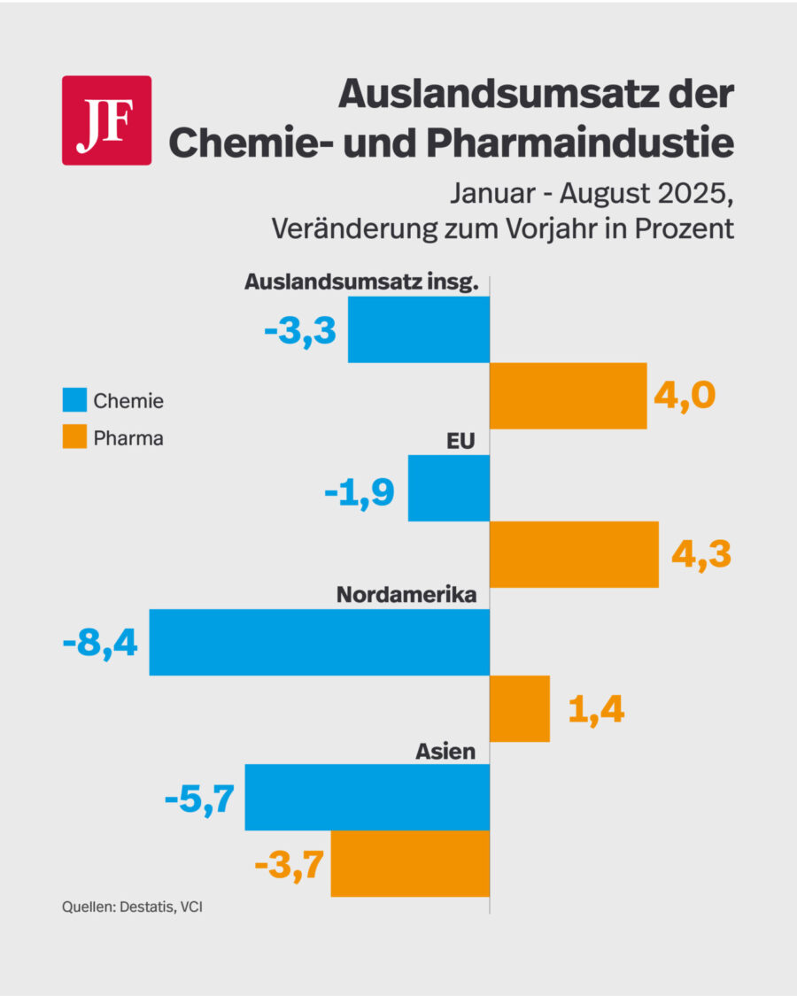 Auch im Ausland konnte die Chemie zuletzt nicht überzeugen: Die Auftragseingänge blieben schwach, die Verkäufe lagen 3,3 Prozent unter dem Vorjahreswert.